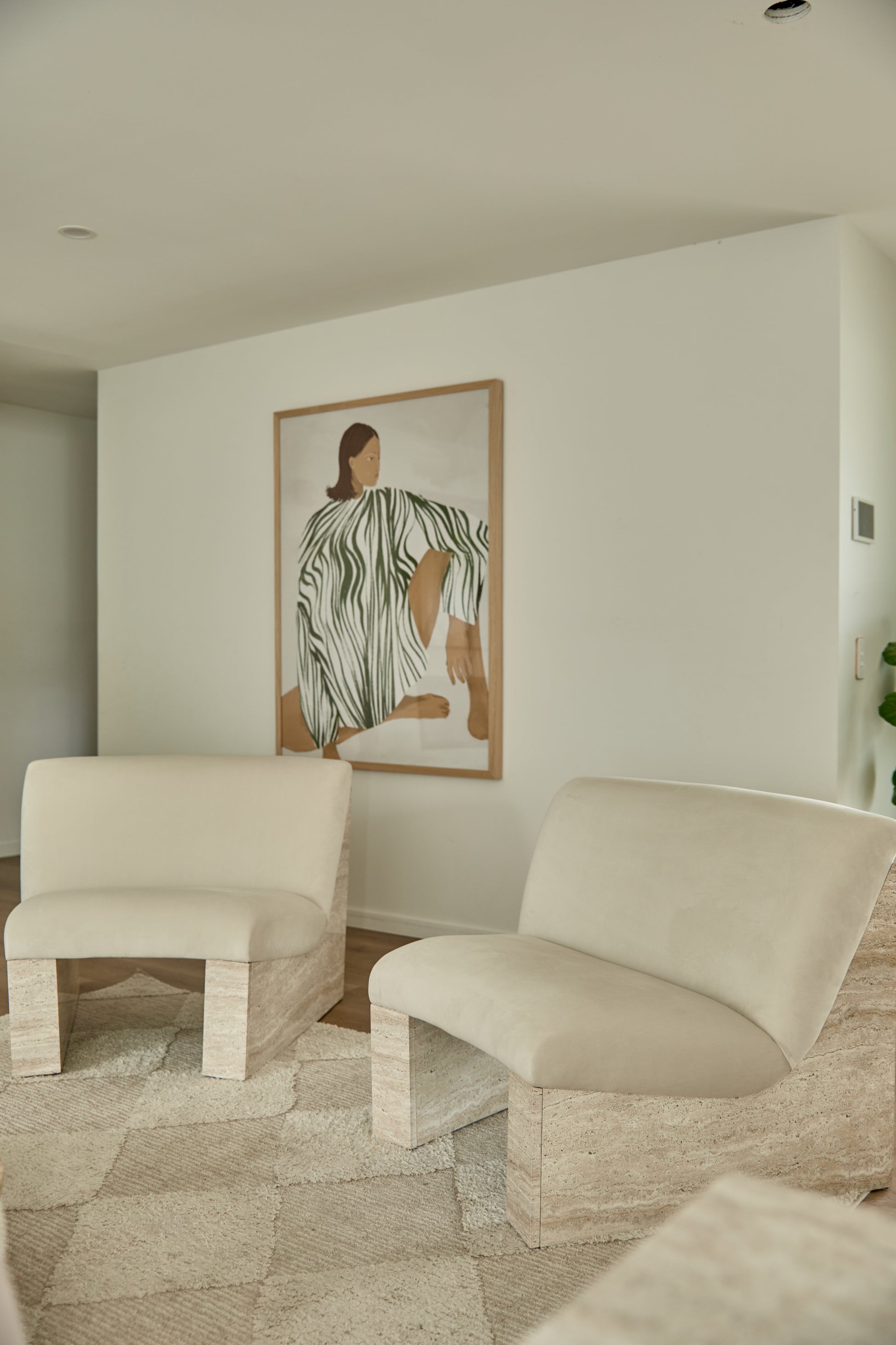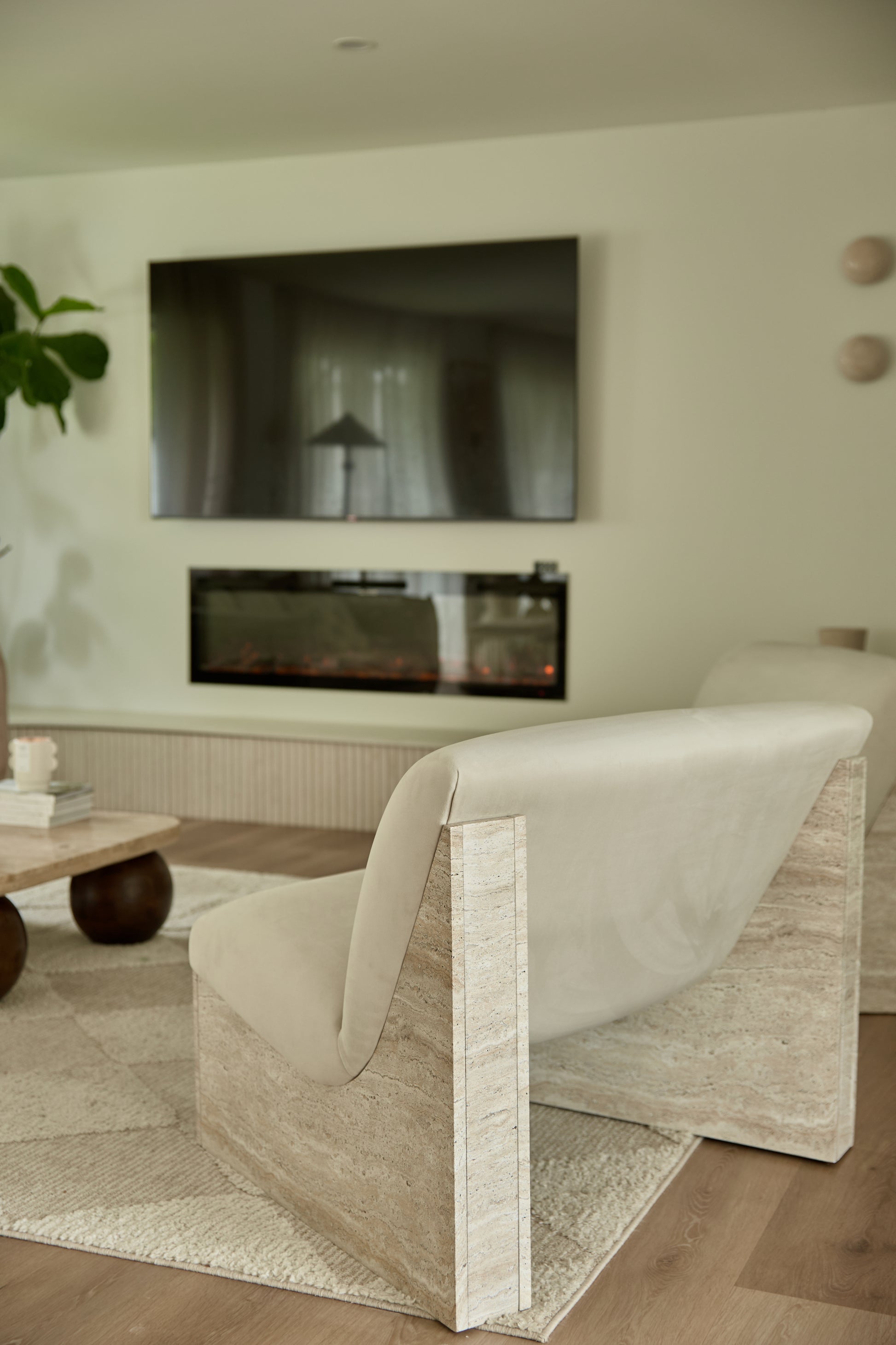 This piece is all about quiet luxury. Its solid base is wrapped in a beautiful travertine film, giving the illusion of carved stone without the weight — grounding the chair with a natural, architectural edge. Up top, we’ve layered it with plush velvet that invites you in. It’s the kind of seat you didn’t know you needed — soft enough for lounging, striking enough to stand alone.